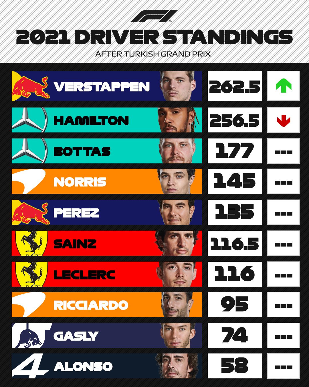 Updated driver and constructor points standings for the 2021 Formula 1 world championship season. Max Verstappens win at the Austrian Grand Prix has now propelled him into a 32-point lead over Mercedes Lewis Hamilton who could only manage fourth at the Red Bull. Updated driver and constructor points standings for the 2021 Formula 1 world championship season.